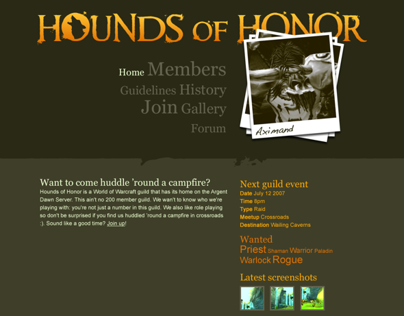 Logo and website design for Hounds of Honor, a World of Warcraft guild. A guild is an in-game association of player characters. Guilds are formed to make grouping and raiding easier and more rewarding, as well as to form a social atmosphere, like huddling around a campfire, in which to enjoy the game.