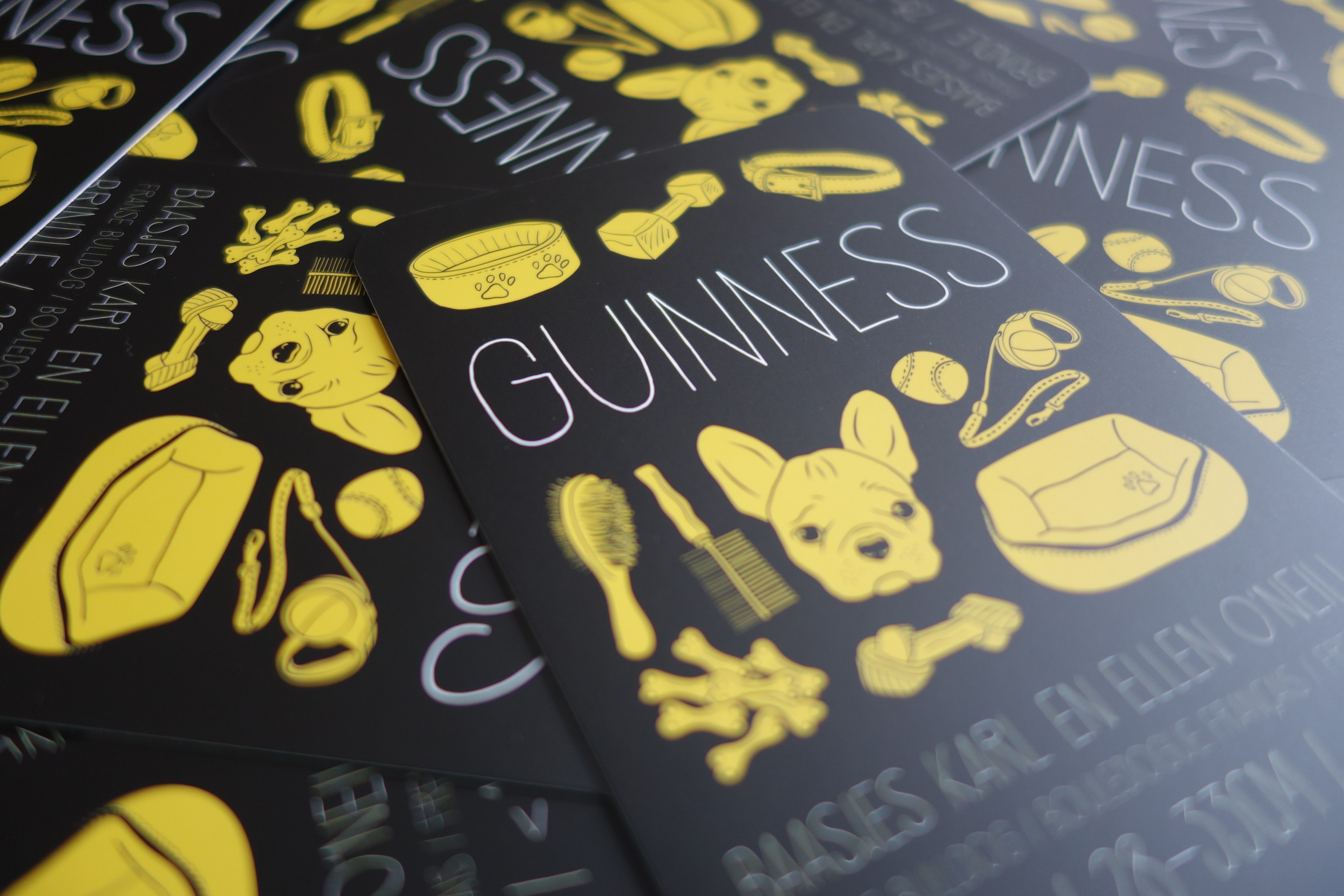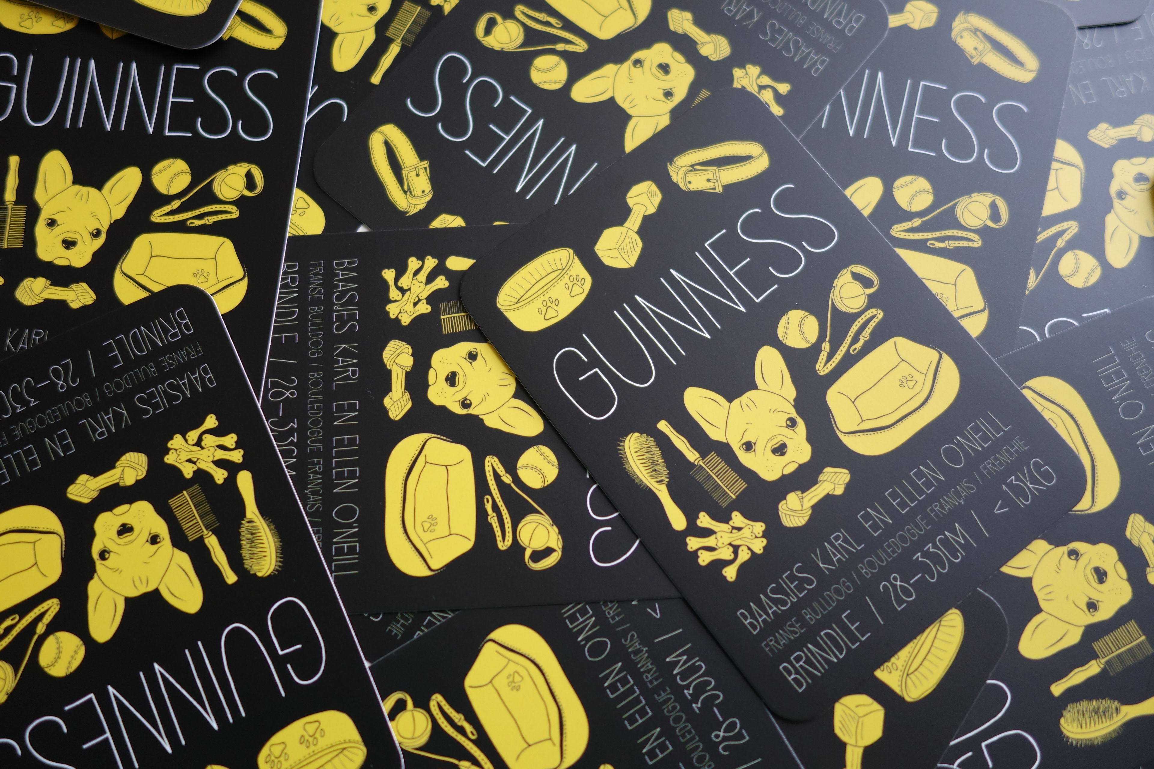 Ontwerp van het 'geboortekaartje' van onze Franse Bulldog, Guinness.