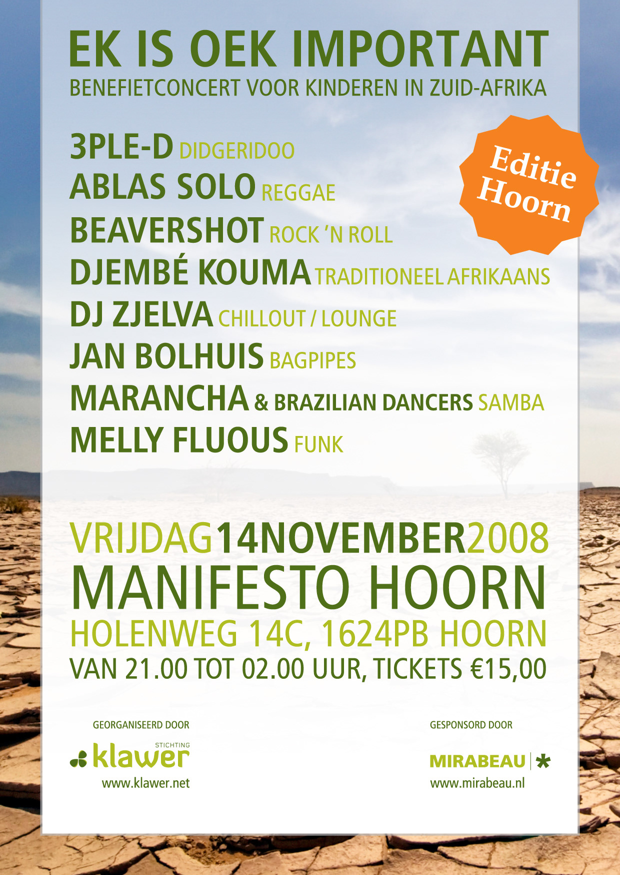 Ontwerp van een flyer voor benefietconcert ‘Ek is oek important’ (Ik ben ook belangrijk) voor kinderen in Zuif-Africa.