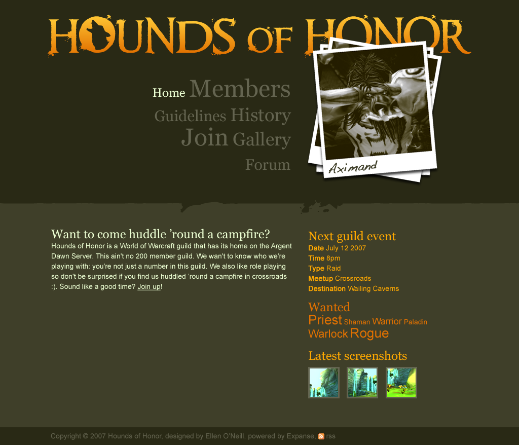 Logo design, website design and WordPress implementation for Hounds of Honor, a World of Warcraft guild. A guild is an in-game association of player characters. Guilds are formed to make grouping and raiding easier and more rewarding, as well as to form a social atmosphere, like huddling around a campfire, in which to enjoy the game.